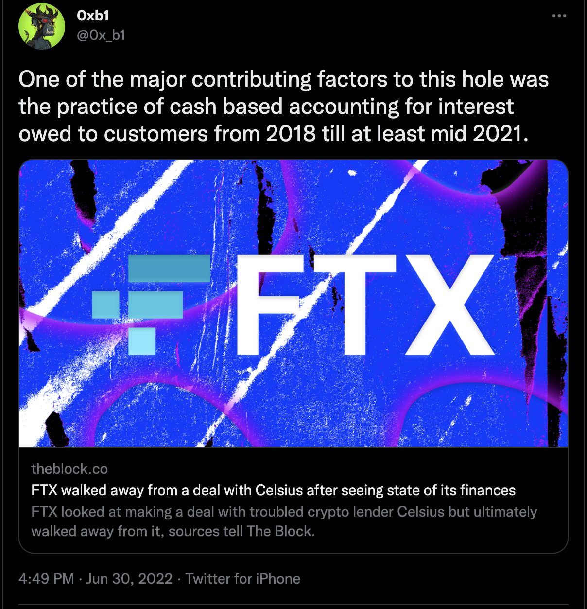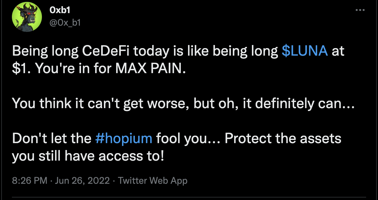 Since Celsius Network’s liquidity crisis, 0xB1 has taken to Twitter to share its perspective on the state of the crypto lending industry. While 0xB1 does not explicitly state its former relationship with Celsius, the barbs are thinly veiled: