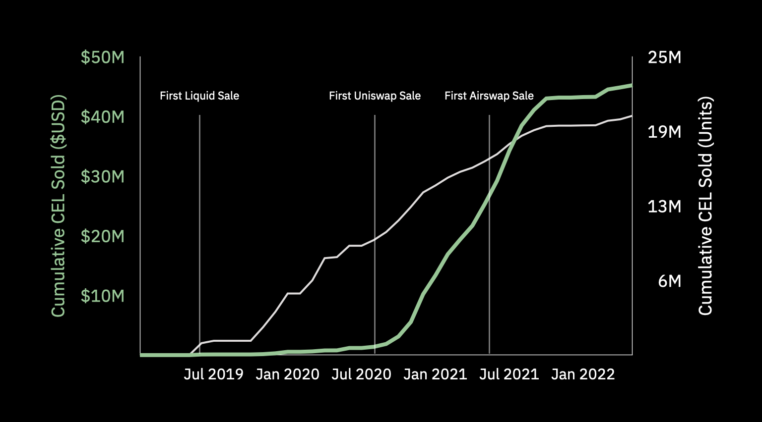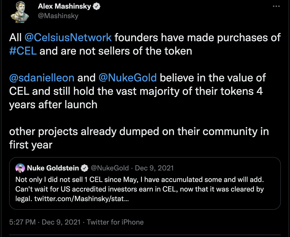 On October 9th 2021, Mashinsky tweeted, “Lots to CELebrate here in #London busy week with a lot of large deals and events. It pays to #HODL.” Nine hours later on the very same day, a suspected Mashinsky wallet sold 12K CEL on Airswap for $69k in USDC. Two months later, on December 9th, he tweeted, “All @CelsiusNetwork founders have made purchases of #CEL and are not sellers of the token.” Just 5 days earlier, on Dec 4, a suspected Mashinsky address sold 11K CEL for $43K in WBTC.