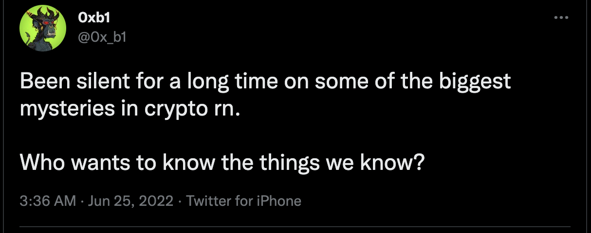 0xB1 clearly disapproves of Celsius’ business practices. These statements also corroborate what the on-chain analysis tells us: Celsius’ management of user funds is notably different from the official story. The moral high-ground 0xB1 takes in their tweets above signals that they may understand the extent to which Celsius’ possibly mismanaged customer’s funds. The on-chain data signals that 0xB1 was at least somewhat involved. The exact legal relationship and contractual agreement between Celsius and 0xB1 remain unclear. It is also unclear where else 0xB1 may have fallen short of expectations outside of its trading performance and liquidations during one of history’s loudest roaring bull markets.